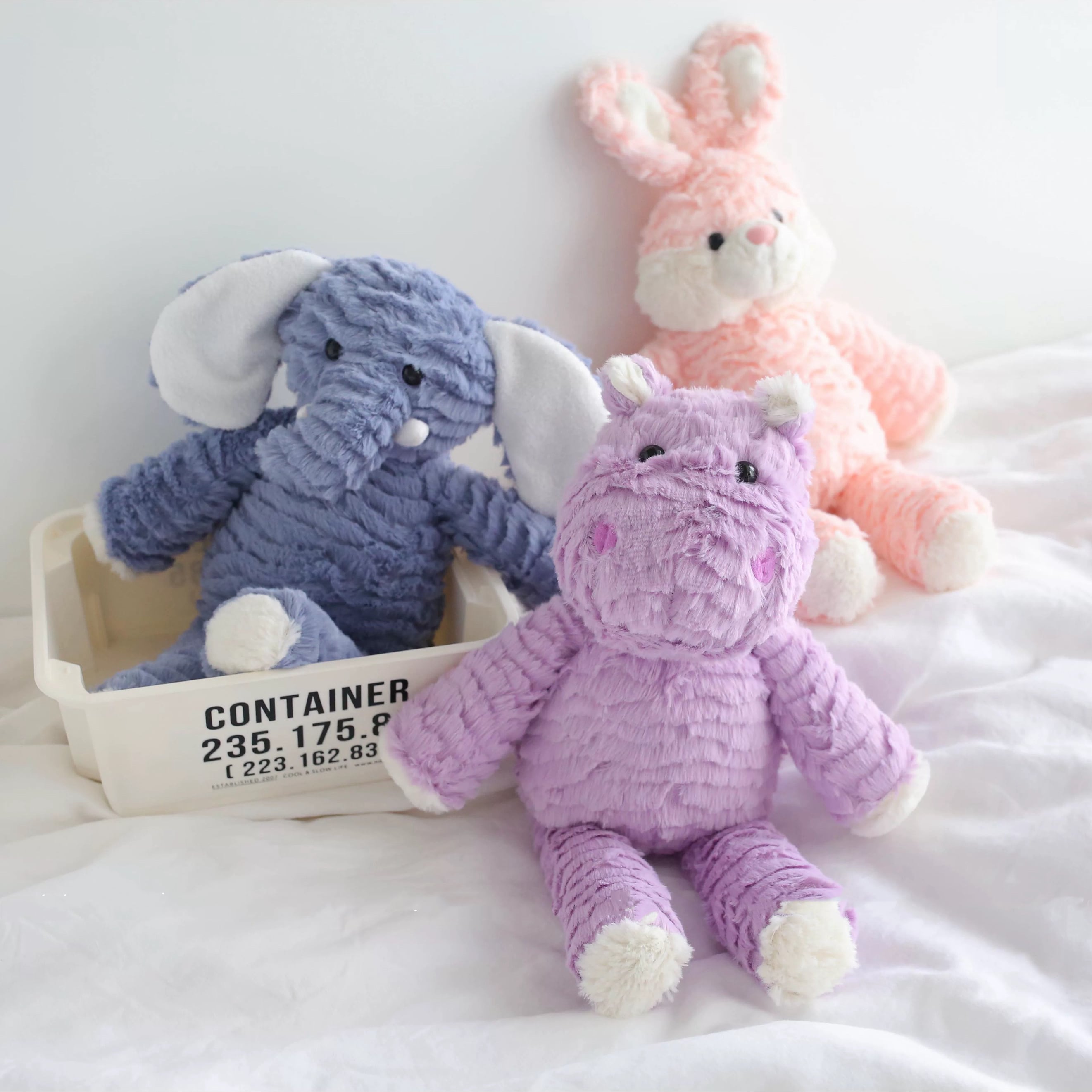 ピンクのうさぎ、パープルのカバ、ブルーのぞうの3種類は、